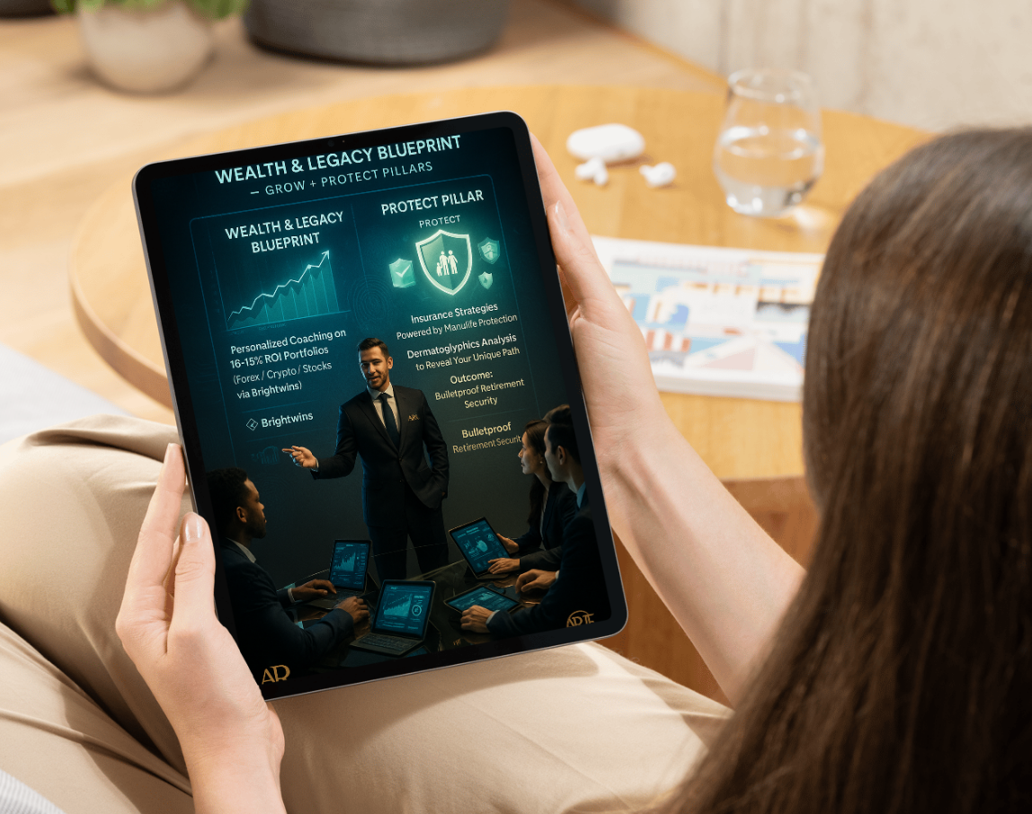 Personalized coaching on 10-15% ROI portfolios (forex/crypto/stocks via Brightwins) and Manulife-backed insurance.